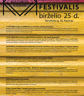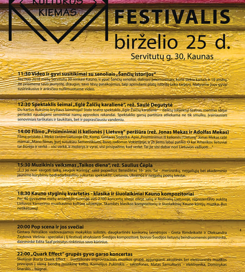 Kviečiame šeštadienį, birželio 25 dieną apsilankyti Aukštuosiuose Šančiuose, Servitutų g. 30, kur vyks Šančių kultūros kiemo festivalis. Festivalio metu bus gausu įvairiausių įvykių - spektakliai, filmų peržiūros, klasikinių, pop, elektronikos ir džiazo kolektyvų pasirodymai. Renginys nemokamas.